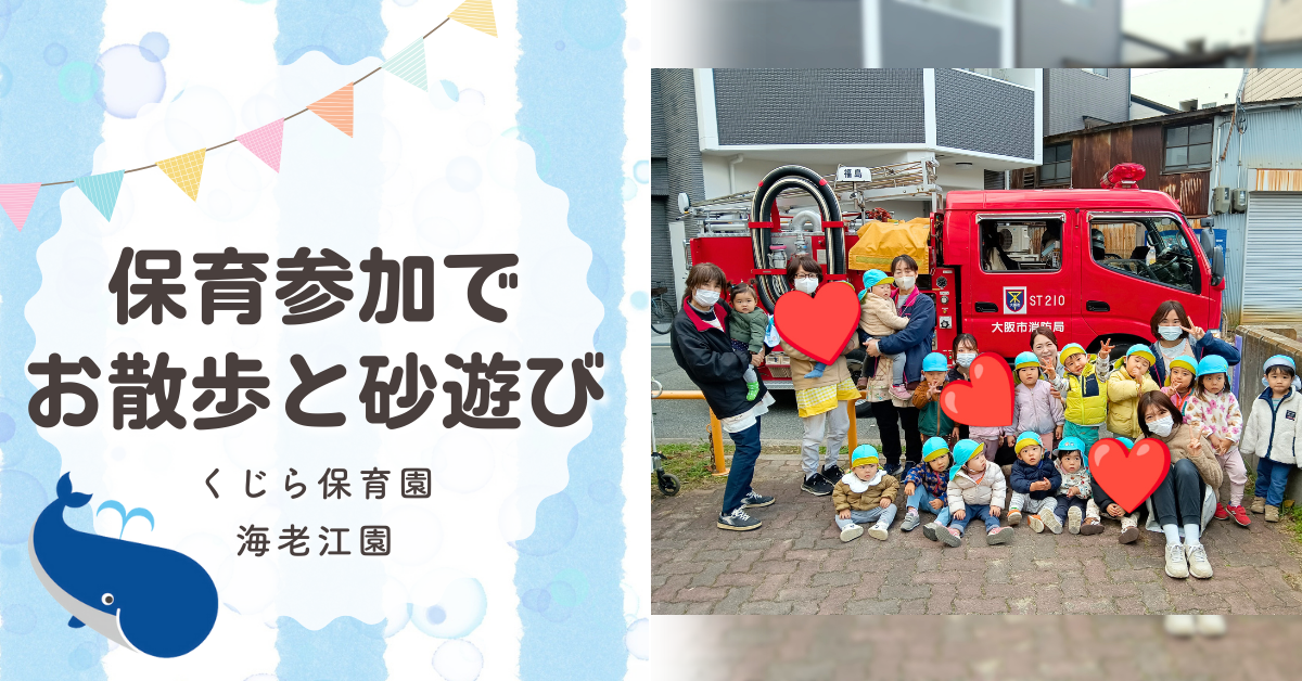 保護者参加型行事について くじら保育園海老江園では保護者参加型の行事があります。お仕事で忙しい保護者の方にお子様と一緒に楽しいひと時を過ごしていただく機会を設けています。普段の保育園でのお子さまの様子を見ていただいたり、成長を感じていただ... -