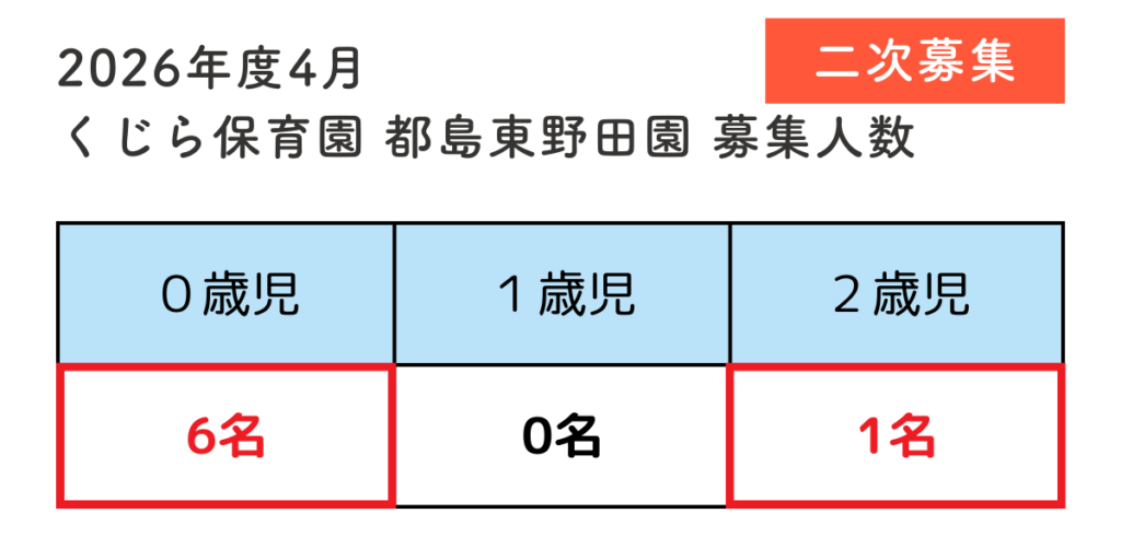 くじら保育園 都島東野田園の二次募集人数は、以下の通りです。