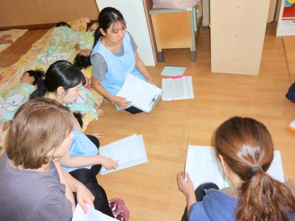 東野田園では週1回、担任が集まり自己反省会を行い、次週の保育に活かしています。