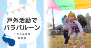 戸外活動では鬼ごっこやかくれんぼ、自然物を使った遊び、遊具遊びなど、さまざまな遊びを楽しんでいる子どもたちですが、戸外でのパラバルーン遊びも大人気です。 特に…