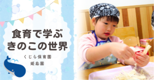 いるかぐみさん(2歳児)できのこの房分けをしました。スープに使用する、しめじとえのきに加え、調理員さんからしいたけも見せてもらい3種類のきのこを観察し、房分け…