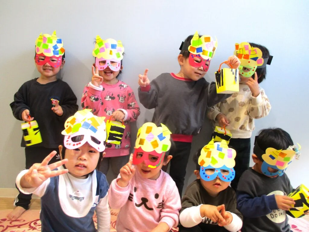小さな手で一生懸命作ったお面は、どれも個性豊かでとっても可愛らしく、保育室がにぎやかに彩られました。