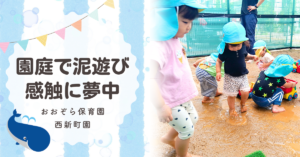 雨上がりや小雨の日には、西新町園の園庭で泥遊びを楽しんでいます。 水と砂がまじりあってできる泥の感触がなんとも心地よく、始めは戸惑っていた子どもも水たまりに足…