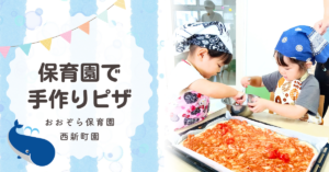 子ども達が楽しみにしていたクッキングでピザを作りました。沢山の具材にもうお腹が鳴りそうです!エプロンを着て、三角巾をして、しっかり手洗いをすると準備万端です♪…