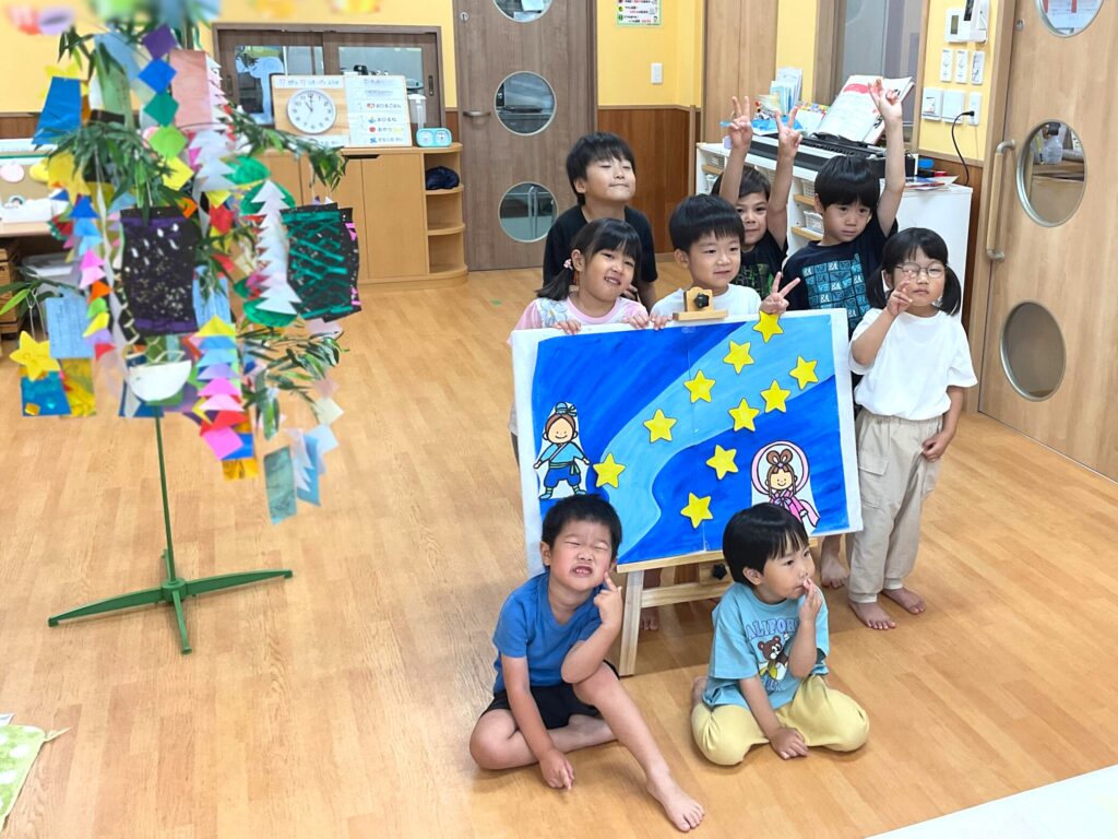 笹に願いごとの短冊を飾って、七夕の行事を楽しみます。お部屋も七夕の飾りでにぎやかに!