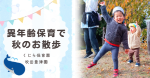 写真は2歳児のいるか組さんや1歳児のぺんぎん組さんが0歳児のらっこ組さんに葉っぱを降らせてあげているところです(*^▽^*)