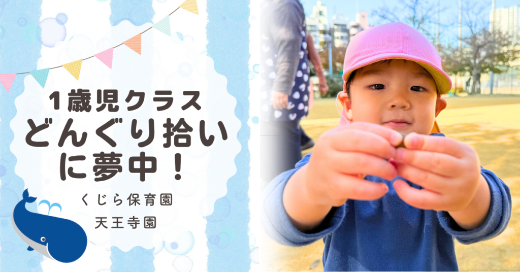 こんにちは、くじら保育園天王寺園1歳児クラスです。今日は五条公園に散歩に出かけました。 どんぐりがたくさん落ちていたのでみんなでどんぐり拾いをしましたよ! ここにも!ここにも!と夢中になって集めていた子どもたち、 こんなにみつけたよ!と手の... -