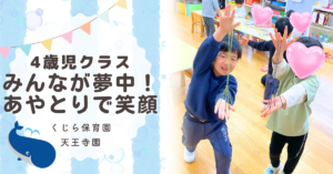 くじら保育園の天王寺園4歳児クラス「ぞう組」では、今、子どもたちの間で「あやとり」が大流行中です!すべてのきっかけは、5歳児クラスの子たちが披露してくれた「ぱっちんほうき」という技でした。その後、子どもたち同士でやり方を教え合い、あっという間にクラス全体へと広がりました。