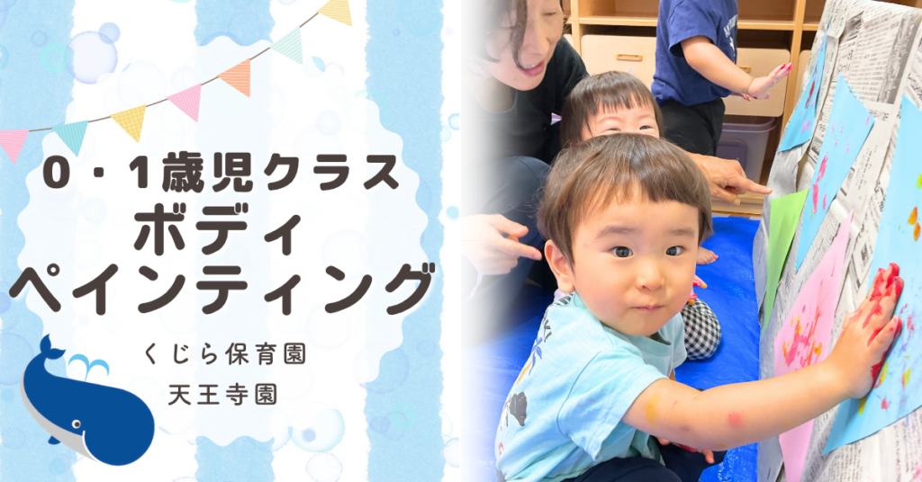 こんにちは、くじら保育園天王寺園0.1歳児クラスです。今日はお部屋でボディペインティングをして遊びましたよ! 最近言葉も増え、色に興味を持っているりすぐみさん、「あか!」「あお!」と色を指差しながら手につけて手形を押したり、 塗り広げたりと全... -