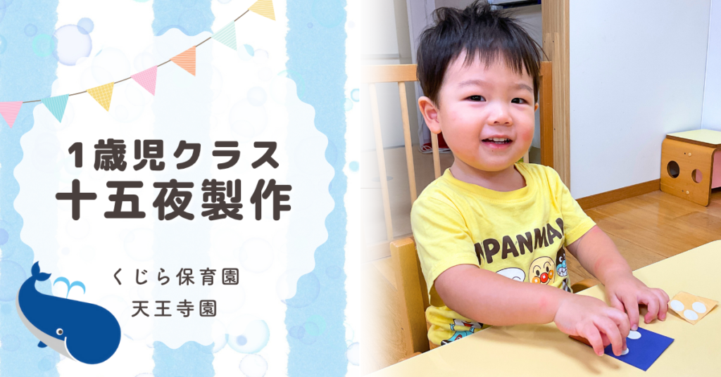 こんにちは、くじら保育園天王寺園1歳児クラスです。十五夜の製作でうさぎと月見団子をつくりましたよ! うさぎはピンクの画用紙に白の絵の具でスタンプをし、目とほっぺのシールを貼りましたよ。 かわいいうさぎができて嬉しそうにみんなに見せていました... -