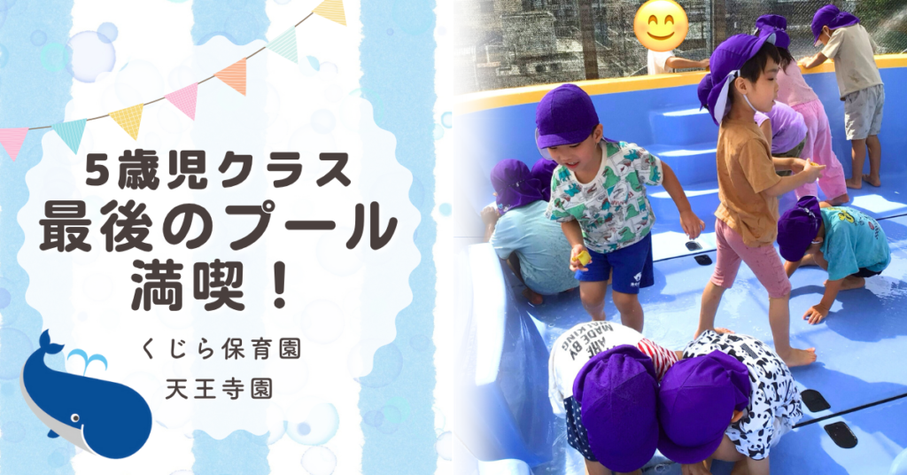 こんにちは!くじら保育園天王寺園5歳児クラスです。今年最後のプールに入りました。今年は気温が高くなかなかプールに入る事ができませんでしたが、入れた時は全力で楽しんでいた子どもたち♪ 最後のプールでも泳いだり潜ったり、みんなで流れるプールを作... -