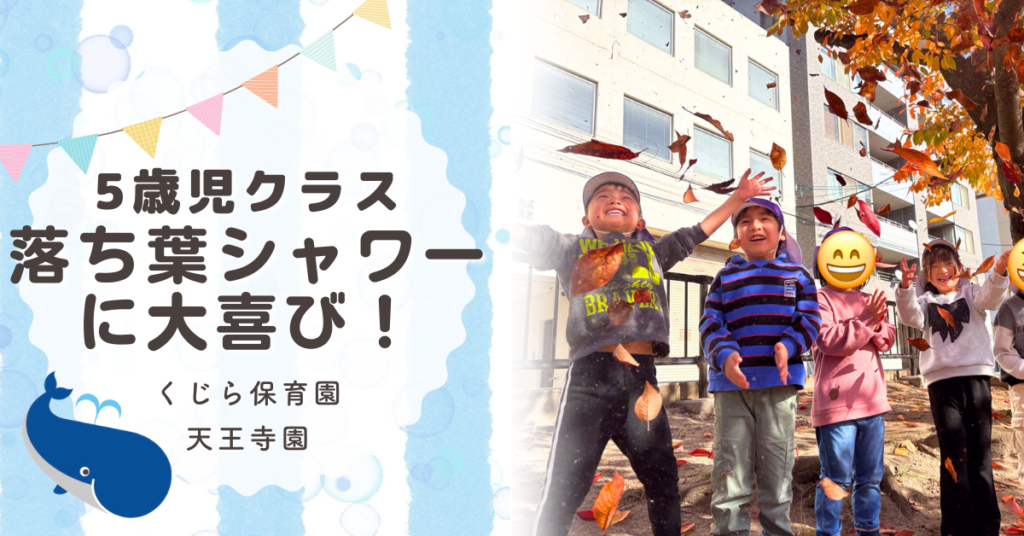 こんにちは!くじら保育園天王寺園5歳児クラスです。戸外で遊ぶことが大好きな子どもたち!ジャングルジムに登ったり、うんていをしたりと上手に遊んでいます(^-^) 体力がすごくついてきて、鬼ごっこはずっと走っています! 落ち葉がたくさん落ちていて「... -