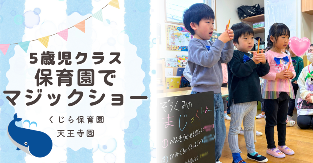 子どもたちの挑戦!マジックショー くじら保育園天王寺園の5歳児らいおんクラスでは、保育者が披露していたマジックに興味を持ち、「自分たちもやってみたい!」という声があがりました。そこで、子どもたちは「どんなマジックを披露するか」を話し合い、... -