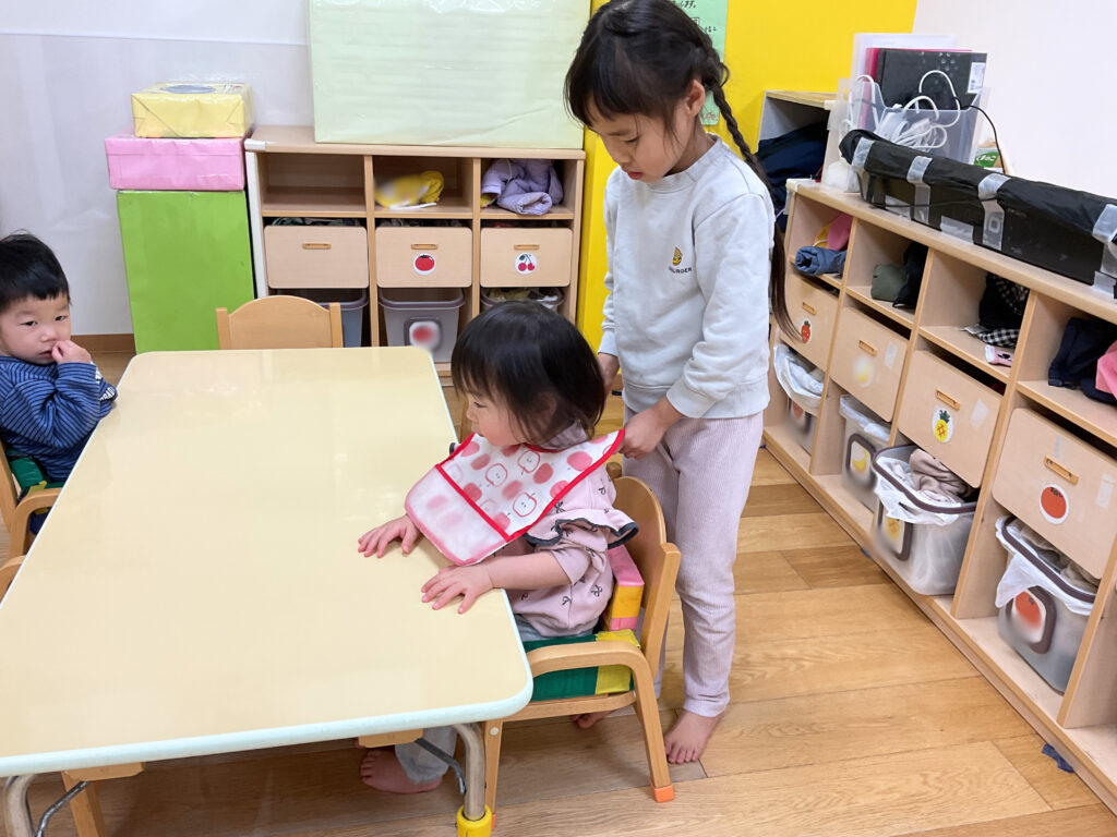 保育士がおやつを準備する間、5歳児が1歳児と一緒に遊ぶ場面も多くあります。1歳児にとっては頼れる存在として安心感を与え、5歳児には「誰かの役に立てた」という大切な経験を提供しています。このような日常の関わりの積み重ねが、子どもたちの心を豊かにする基盤となっています。
