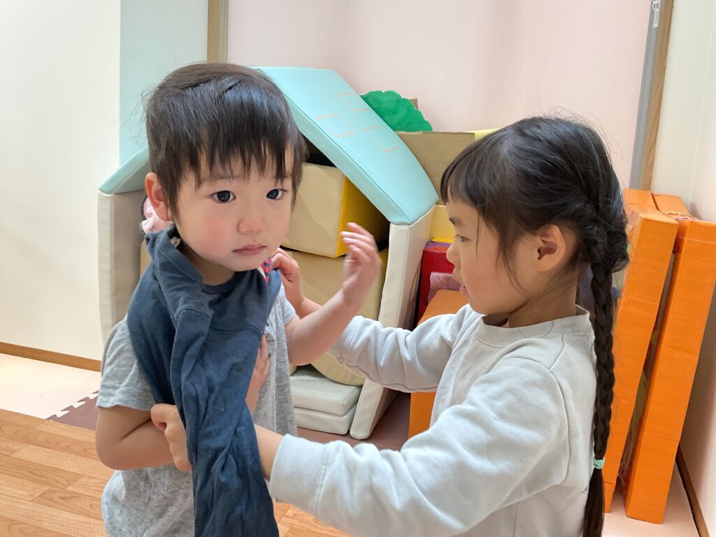 5歳児の子どもたちは、1歳児のペースに合わせて袖を通すのを待つことがあります。