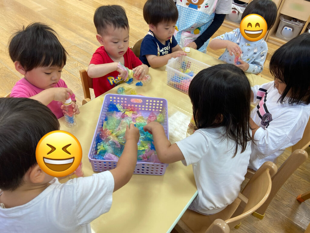 最後は、みんなでジュース作り☆彡R-1の容器にすずらんテープを自由に入れて、最後に水を入れました。1人1人のオリジナルのジュースができました❤︎