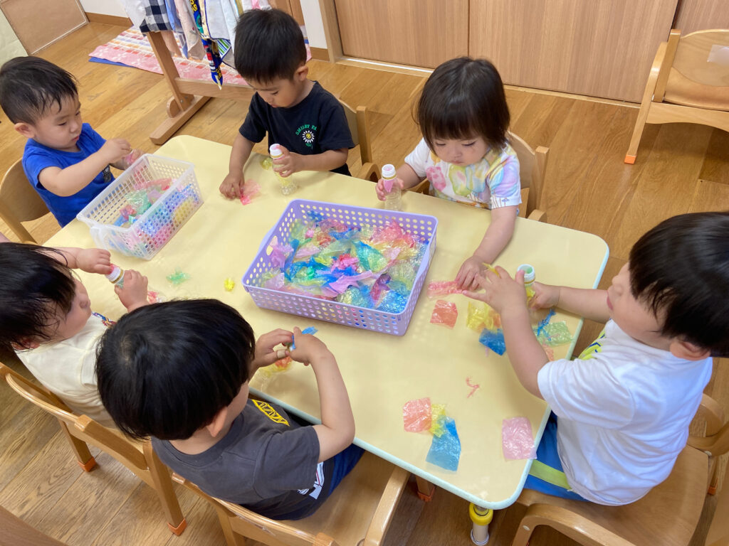 今日は5色のすずらんテープを使って遊びました。透明のコップを1人1個ずつ渡すと、すずらんテープをたくさん入れてミックスジュースに見立てて飲んだり、赤とピンクのみを入れてりんごジュース、黄色のみを入れてパイナップルジュースなどに見立てている子どももいました。