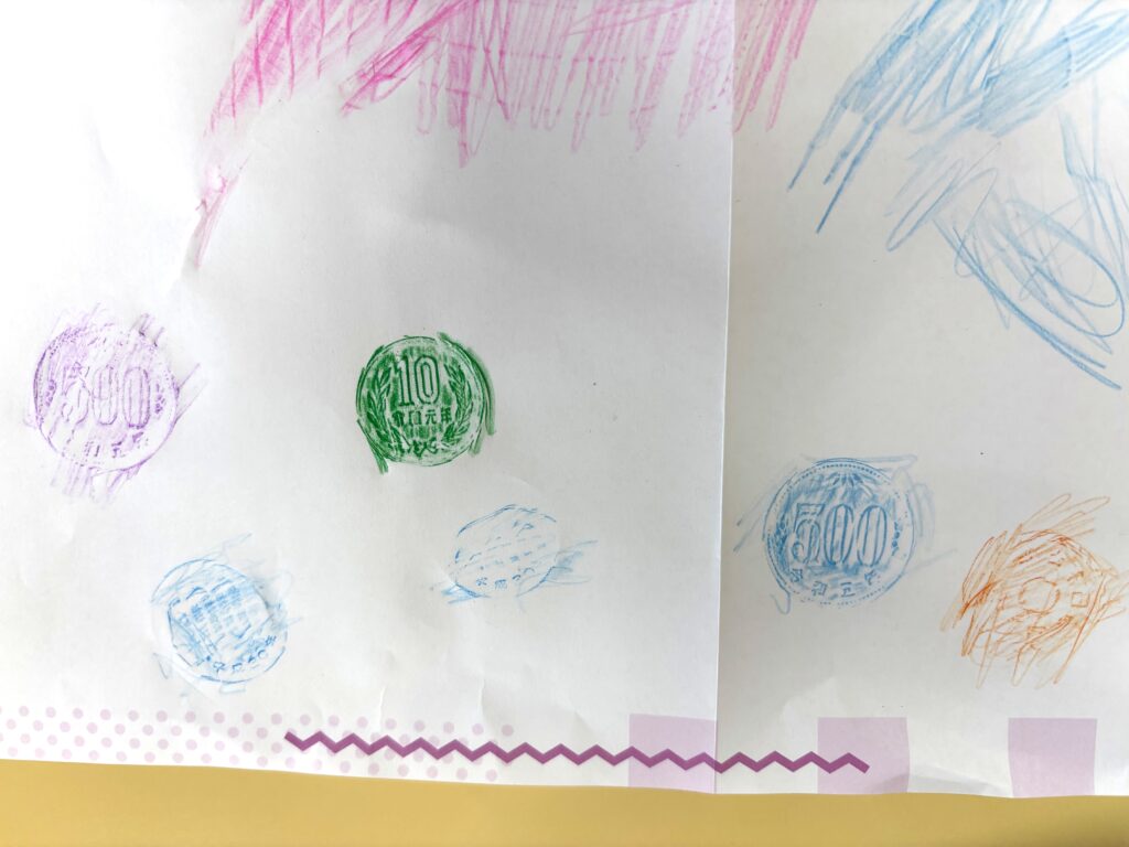 今日は月刊絵本に載っていた“うつるんがみ”を使ってフロッタージュ技法(こすりだし)をしました。