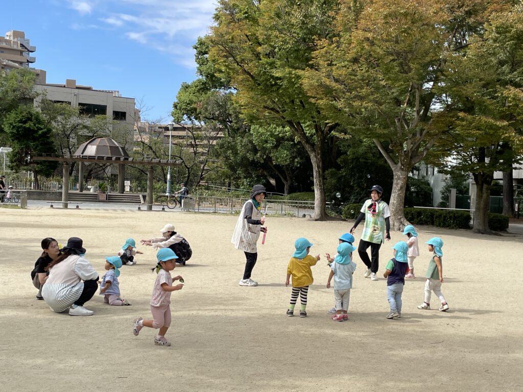 公園では、お友達と関わる姿を見てもらったり、一緒に走って遊んでもらったり、木の実などを拾ったりなどのんびり遊びました。