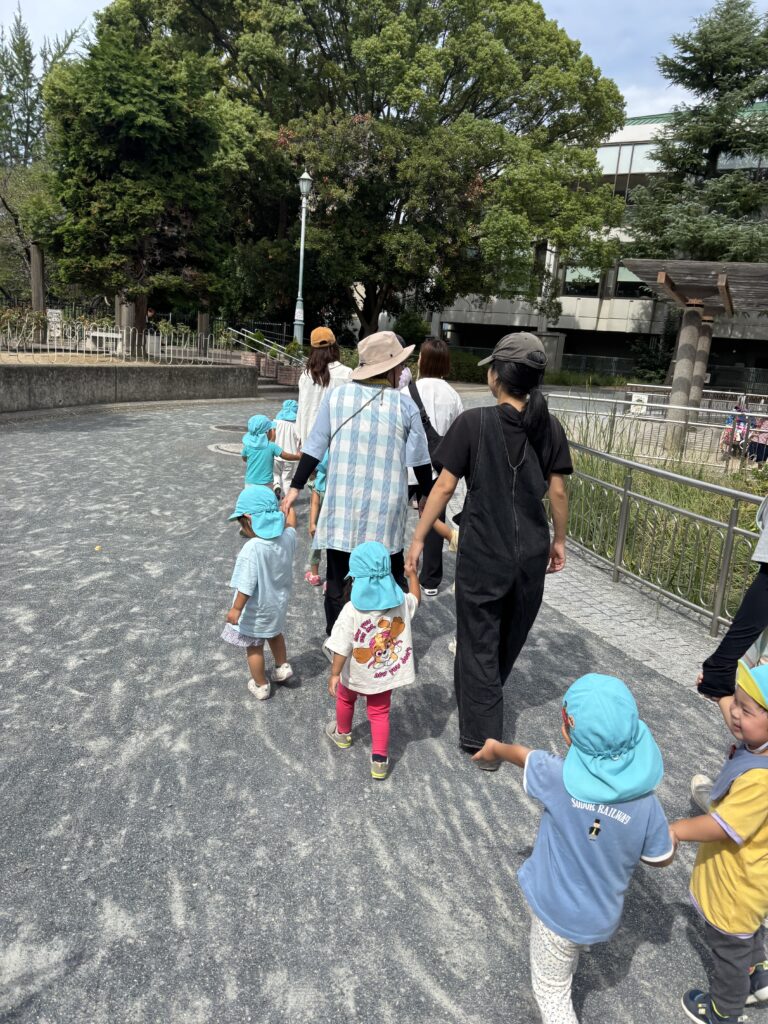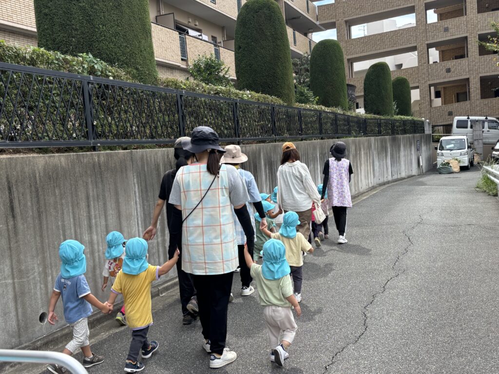 めいっぱい楽しんだ水遊びも終わり、お散歩を再開しました! 久しぶりのお散歩に子ども達も少しドキドキしている様子でしたが、手を繋いだりバギーに乗ると「てをつなご…