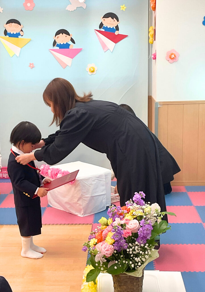 お父さんやお母さんに見守られながら、緊張感いっぱいで入場した子どもたち。一人ひとり名前を呼ばれると、元気よくお返事し、はっきりとした声で「ありがとう」の言葉を伝える姿が印象的でした。その堂々とした態度に、保護者の皆さんも温かな微笑みを浮かべていました。