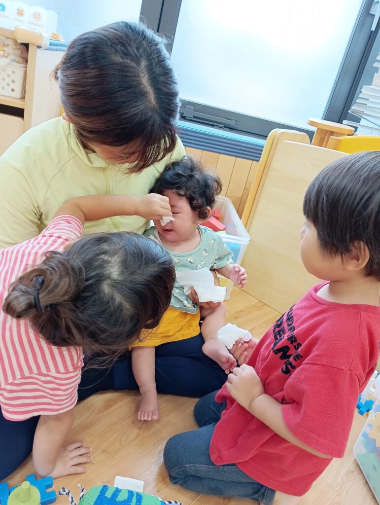 入園してきて間もない小さなお友だちが泣いていると、ティッシュペーパーをとってきて、そっと涙や鼻水を拭いてあげるなど自然に保育者と同じような行動をとっています。